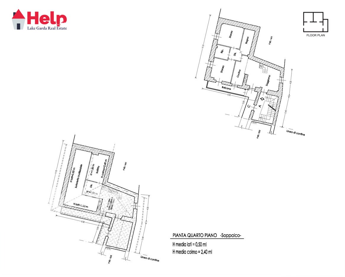 Così composto: ingresso su soggiorno con angolo cottura, disbrigo, due camere da letto matrimoniali, ripostiglio e bagno con box doccia; soppalco uso studio-stanzetta-cabina armadio nella zona giorno.